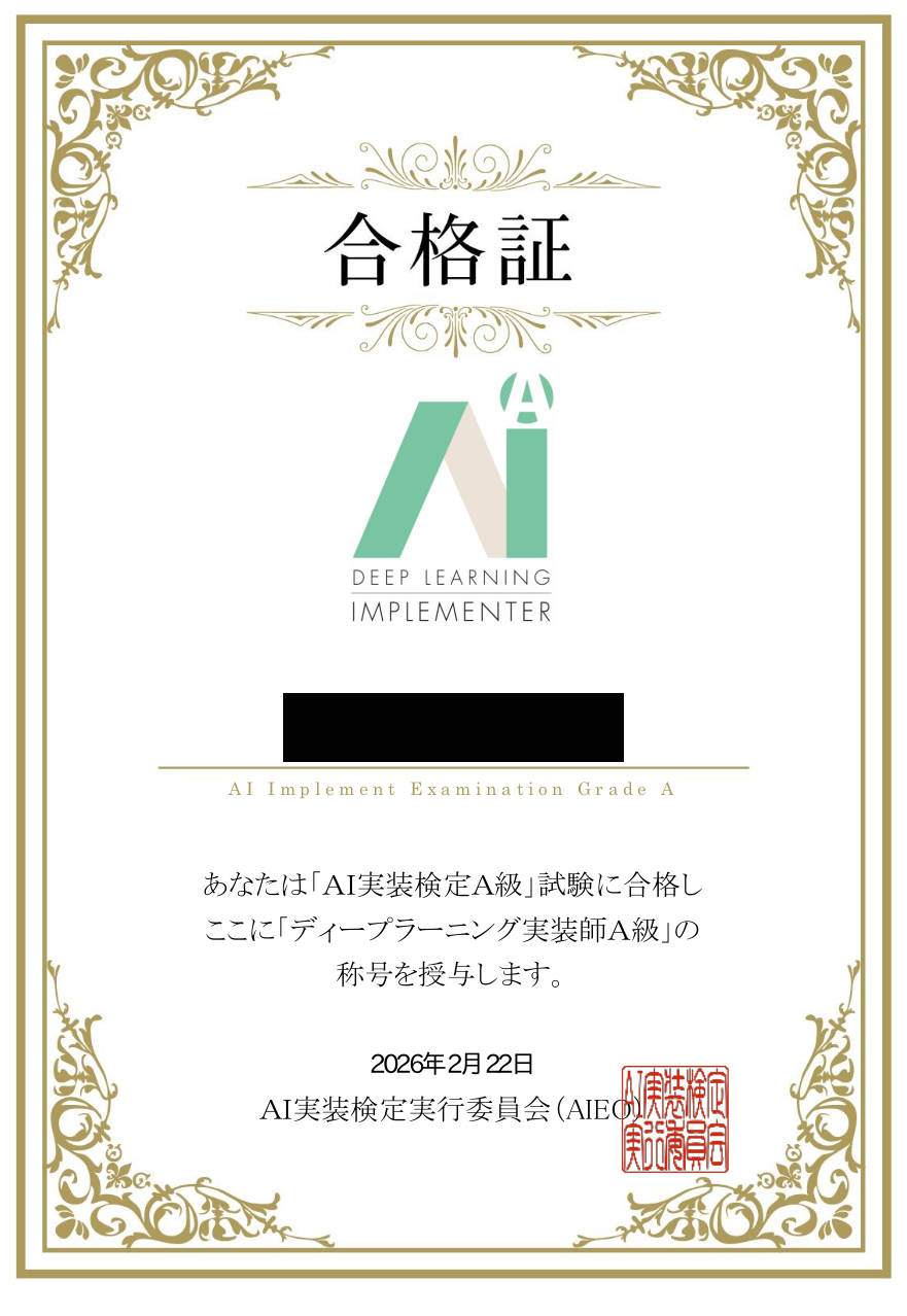 もうすでに2ヶ月以上前のことではあるが、AI実装検定A級の合格をしたのでここにその過程をまとめる。